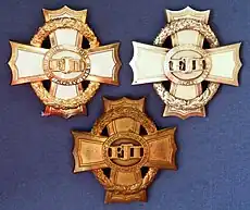 - Croix de 3e classe: argent, branches émaillées de blanc.
