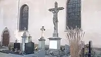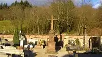 Dans l’enceinte du cimetière, au pied du Kast, se dresse une grande croix en grès rouge qui date de 1838. Au-dessus de l’image du Christ, est sculptée une tête de mort et un serpent qui mord dans la pomme. On distingue les instruments de la passion du Golgotha. Sur le socle on peut voir l’inscription « Non istum Christum sed per istum credo Christum » (Je crois non que ceci soit le Christ mais c’est par celui-ci que je crois que le Christ est).