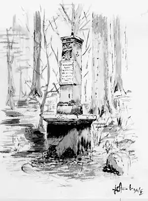 Une petite croix latine gravée, à une date ultérieure, se trouve en dessous du texte. La face avant du fût comporte un cartouche en retrait ou figure un bas relief représentant un assez joli motif finement stylisé d’inspiration végétale. Ce qui reste du monument original a reçu des impacts de projectiles (balles, éclats d’obus) sans doute lors des combats des 25, ; une compagnie du 21e Bataillon de chasseurs à pied[16], protégeait le long de la ligne de chemin de fer, la retraite du Bataillon vers la Chipotte.