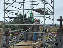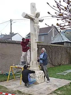 La maison contre laquelle cette croix était érigée a dû être reconstruite à la suite d’un incendie. Le monument fut démonté et entreposé aux services techniques de la ville, il a été remonté dans le courant de l’année 2003 et implanté au milieu d’un terre-plein créé spécialement. La face avant est tournée à présent vers la Place de la Libération. Le piédestal se trouve dorénavant hors sol.