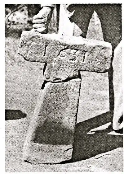 Chaque extrémité de la traverse possède une cavité rectangulaire ; la branche supérieure de la hampe possède sur l’arrière un curieux bossage ? La base du fût s’élargit par un adoucissement de quatre angles sur huit au contact du piédestal. Aux quatre angles du fût, là où il se raccorde au piédestal, se trouve un bossage arrondi, vaguement en forme de demi sphère, très usé, qu’il n’est plus possible d’identifier.