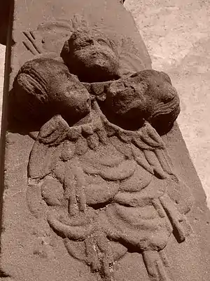 Ce médaillon est relié à la base du chapiteau par un motif traité en bas-relief représentant un entrelacs de cordelettes dont chaque extrémité est terminée par un gland. Sous le médaillon, un cartouche en retrait comprend un bas-relief représentant le triangle divin[11] avec un œil au centre, le tout sur un fond rayonnant.