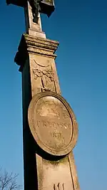 Le monument est dans un état de dégradation avancée. La pierre utilisée, également un grès jaunâtre, est particulièrement poreuse, gélive et se délite facilement. La pollution atmosphérique joue également un rôle important sur ce type de roche. Le monument se compose d’un appareil très classique. Un piédestal parallélépipédique sommaire est surmonté d’une corniche rudimentaire, légèrement débordante au profil en doucine inversée, finissant par un bandeau. Le tout est très altéré, la face avant est de couleur vive ce qui prouve que l’érosion de la pierre est toujours en cours. Au-dessus du piédestal s’élève un fût prismatique de section rectangulaire surmontant une base et supportant dans sa partie haute un chapiteau. La base est quadrangulaire composée d’un bandeau, suivi d’une moulure en ½ rond. Le fût débute par quelques moulures : filet, gorge, listel, ½ rond. La face avant du fût est ornée de différents motifs. Dans la partie médiane se trouve un médaillon en mi-relief largement débordant, de forme ovale. Une épigraphe s’y trouve gravée dans un cartouche en léger retrait. Le pourtour est souligné par une épaisse bordure.