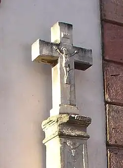 - Une croix simple, nue ou ornementée avec certaines représentations (Vierge à l'Enfant, ostensoir, soleil rayonnant...), ou encore un Christ en croix surmonte le chapiteau ou le tailloir.