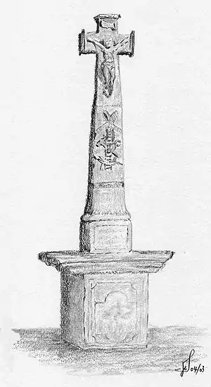 Sur un piédestal massif s’élève une croix monolithique. Celui-ci, parallélépipédique, comporte sur l’avant un cartouche carré surmonté d’un demi-cercle plus étroit. Le cartouche est souligné par un double trait gravé ; aucun texte n’est lisible. Le fût est un prisme de section octogonale se rétrécissant vers le haut et terminé par une croix latine aux branches très courtes. L’ensemble est d’une grande sobriété, d’allure médiévale, gothique. Au centre de la traverse se trouve gravé le millésime :