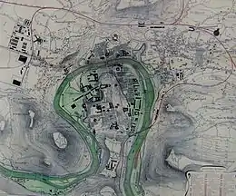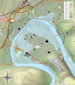 La ville de Besançon s’inscrit dans un important méandre du Doubs de près d’un kilomètre de diamètre parfois comparé à une presqu'île, prenant la forme d’une boucle presque parfaite fermée et surplombée par le mont Saint-Étienne, un haut plateau ouvert sur le Jura[a 1]. Puis la ville a débordé de ce cadre initial pour s’étendre dans une cuvette entourée de sept collines : Chaudanne (422 m), Bregille (458 m), Saint-Étienne (371 m), la Roche d’Or (316 m), Planoise (490 m), Rosemont (466 m), Fort-Benoit (360 m[a 1]). Ce site spécifique a ainsi pendant longtemps été un emplacement idéal de développement urbain, tant d’un point de vue stratégique et militaire (site défensif) qu’économique et commercial (débouché fluvial, forêts, agriculture et élevage[a 1]).
