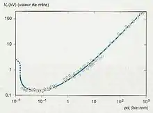 Mais l'inconvénient majeur du bain pompé pour le refroidissement des bobines supraconductrices est que l'on est à basse pression (quelques millibars à quelques dizaines de millibars). La tenue diélectrique de l'hélium est alors très faible, illustrée par la courbe de Paschen (figure 5).
