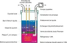 La figure 8 illustre également comment obtenir une source froide à 1,8 K pour refroidir le bain. De l'hélium liquide (à 4,2 K) est prélevé dans le bain principal, à la pression atmosphérique. En faisant subir à ce liquide une détente isenthalpique (dite de Joule-Thomson), on va abaisser sa température, au prix de l'évaporation d'une fraction de cet hélium. La température de l'hélium après détente est fixée par la basse pression que la pompe est capable de maintenir au bas de la canalisation de pompage. Le rendement de la détente peut être grandement amélioré si l'on pré-refroidit l'hélium liquide prélevé à 4,2 K en le faisant passer dans un échangeur traversé par les vapeurs froides pompées. La détente a lieu dans une vanne Joule-Thomson réglable permettant d'ajuster le débit. En traversant la vanne, l'hélium liquide se refroidit et se vaporise partiellement. C'est la fraction évaporée qui fournit les frigories servant à refroidir le liquide restant. Ce mélange diphasique est amené dans une boîte d'échange située au pied de la canalisation de pompage. La fraction évaporée est avalée par la pompe via la canalisation de pompage. Le liquide refroidi à 1,8 K coule au fond de la boîte et sert de source froide pour le bain qui l'entoure (bain de la bobine). En absorbant de la chaleur du bain, le liquide de la boîte est évaporé et évacué vers la pompe.