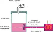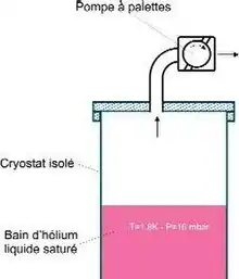 Le moyen le plus simple pour obtenir un bain d'hélium superfluide est de remplir un réservoir d'hélium liquide à 4,2 K, puis d'abaisser progressivement la pression au-dessus du bain en pompant dessus (voir figure 4).