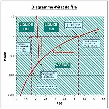 Pour obtenir du superfluide, il faut franchir la ligne lambda (voir figure 3), et donc abaisser la température en dessous de 2,16 K. L'hélium superfluide est très intéressant pour refroidir des bobines, car outre les basses températures qu'il permet d'atteindre, il présente une conductivité thermique extraordinairement élevée (jusqu'à 1 000 fois plus grande que celle du cuivre par exemple).