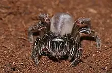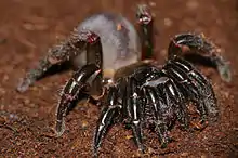 Les mâchoires sont cylindroïdes divergentes et la lèvre sternale est courte et obtuse[15]. Les mandibules sont horizontales et les chélicères fléchis[15]. L'extrémité de l'article basal des chélicères[23] présente une protubérance interne dentée[3] constituée d'une rangée de cinq à six pointes[15],[23],[14] formant une espèce de râteau tranchant[21],[24], le rastellum[25]. Les palpes sont munis de piquants[15],[14]. Les pattes sont velues[26] et se terminent par des griffes munies de piquants formant des peignes microscopiques[24],[14] et d'une unique dent située à leur base[15],[23],[21]. Seuls les tarses des quatre pattes antérieures sont garnis de piquants[15],[23].