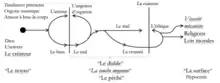 Le schéma de la cuirasse caractérielle montre une énergie initiale contrecarrée par une tension musculaire acquise, qui dévie et transforme la pulsion initiale en son contraire, qu'une autre adaptation, cette fois-ci sociale, transforme à son tour en caractère "socialisé".
