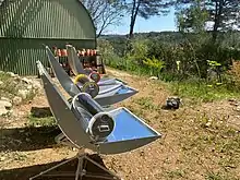 Une version simplifiée utilise un miroir courbe qui concentre les rayons sur une ligne. Un tube noir placé sur cette ligne chauffe, ce qui est placé dans le tube cuit grâce à cette chaleur[22].