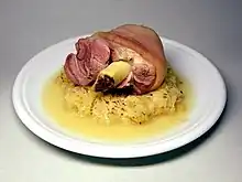 L'Allemagne est principalement connue pour la diversité de ses préparations à base de porc. Cela représente près de la moitié de la viande consommée en Allemagne. Les saucisses se déclinent sous plusieurs formes : Wiener Würstchen, petites saucisses de Nuremberg (Nürnberger Rostbratwürstchen), saucisses de Thuringe (Thüringer Rostbratwurst), Leberwurst[8], Blutwurst[9], Weißwurst de Munich, Currywurst de Berlin, Brägenwurst[10] d'Allemagne du Nord, Grützwurst[11]. Mais on trouve aussi des spécialités de jambon, de jambonneau ou de jarret de porc (Eisbein) : jambons de Westphalie, de la Forêt-Noire ou d'Ammerland, jarrets de porc aux knödel ou à la berlinoise. La viande se sert en général en morceaux copieux comme la célèbre Wiener Schnitzel. Le jarret de porc (Schweinhaxe) et le rôti de porc à l'aigre (Sauerbraten) sont à la base de nombreuses spécialités régionales.