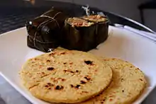 - El tamal, porc ou poulet grillé avec du riz et des légumes, cuits dans une feuille de bananier.