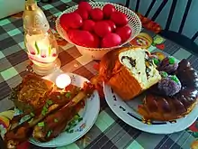 - tsouréki, parfois entouré d'œufs de Pâques rouges