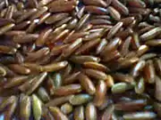 Le riz rouge de Camargue est un riz complet dont le péricarde est teinté par mutation naturelle d'un rouge foncé[25]. Lorsqu’il est cultivé de façon biologique, sa récolte se fait à pleine maturité pour que son goût subtil et sa texture particulière soient totalement préservés. Il est de plus séché naturellement sous les effets conjugués du soleil et du mistral[26].