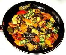 La ratatouille est une spécialité culinaire provençale, comtadine, niçoise, que l'on trouve également sur le pourtour méditerranéen où elle existe sous d'autres noms[20]. Le mot « ratatouille » vient de l'occitan ratatolha. Il est également utilisé dans toutes les langues, y compris en anglais ; la ratatouille se dit aussi « valentine » dans le sud de la France. L'origine du mets se situe dans la zone provençale et de Nice. Le catalan xamfaina et le majorquin tombet sont d'autres versions du même mets.