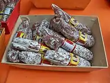 C'est un mélange de viande maigre d'âne, de porc et de bœuf, de gras de porc, de sel et de différentes épices. De forme cylindrique, gris rose, et d'un poids de 300 grammes environ, il a une longueur de 15 à 20 centimètres pour un diamètre variant entre 4 et 5 centimètres[14].