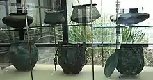 - les louches, cuillers et couteaux, l'harpago, la trulla, la furca et le carnarium, servent à couper les aliments ; la fourchette existe également, apparue au Ier siècle dans l'Empire romain, mais son usage reste mal connu[1] ;