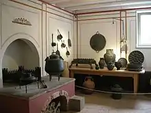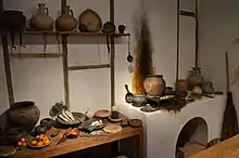L'archéologie montre que ces cuisines disposent d'une structure maçonnée, dite potager, pour cuisiner. Sur cette structure, et sur un lit de braises, les différents ustensiles peuvent être posés, au besoin sur des supports du genre trépied. Un four à pain peut aussi être installé.