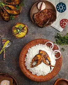 Le riz constitue l'aliment de base et est consommé avec différents currys. Les plats manifestent de fortes saveurs aromatiques ; elles comprennent souvent des œufs, pommes de terre, tomates et aubergines ; elle a recours à une variété d'herbes et d'épices ainsi que l'huile de moutarde et le ghi. Les principaux pains sont le naan, paratha, roti, bakarkhani et luchi. Le dal est le deuxième aliment après le riz. Le poisson, surtout d'eau douce joue un rôle important ; parmi les plus grands plats (ilish), pabda (stromateidae), rui (rohu), pangash (poisson-chat pangas), chitol (poisson-couteau ocellé), magur (silure grenouille), bhetki (barramundi) and tilapia. La viande comprend la viande bovine, l'agneau, le gibier, le poulet, le canard, le pigeonneau et le koël. Les plats de légumes, tels que la purée de bhurta, sabj bouilli ou saag feuillu sont très servis. Crevettes et homard prévalent également.