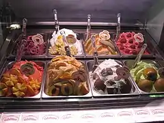 L'histoire de la glace, ou gelato en italien, trouve son origine dans les desserts glacés servis dans la Rome antique et l'Égypte[35]. Plus tard, le gelato est apparu au cours de banquets à la cour des Médicis, à Florence. En fait, c'est l'architecte florentin, Bernardo Buontalenti, qui aurait inventé la crème glacée en 1565 ; il présenta sa recette et ses techniques novatrices de réfrigération à Catherine de Médicis. C'est en 1686 que le Sicilien, Francesco Procopio, perfectionna et modernisa la crème glacée. La popularité du gelato s'étendit dans toutes les couches sociales dans les années 1920-1930, et c'est dans la ville italienne de Varèse que la charrette à glace mobile a été développée.