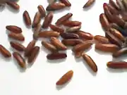 Le riz rouge de Camargue est un riz complet dont le péricarde est teinté par mutation naturelle d'un rouge foncé[21]. Cultivé de façon biologique, sa récolte se fait à pleine maturité pour que son goût subtil et sa texture particulière soient totalement préservés. Il est de plus séché naturellement sous les effets conjugués du soleil et du mistral[22]. Le riz en Camargue, qui est essentiellement un riz long, bénéficie d'une indication géographique protégée par l'INAO.