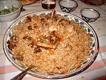 Le plat national de l'Ouzbékistan est l'osh, un plat composé de riz, de mouton et de légumes, dont les variantes sont très nombreuses, à titre d'exemple, il est possible d'y ajouter des carottes, des pois chiches, des feuilles de vigne, des raisins secs ou du coing. Bien qu'il se trouve dans de nombreux restaurants, il demeure cuisiné par les familles lors des grandes occasions (mariage ou fin du ramadan)[1].