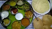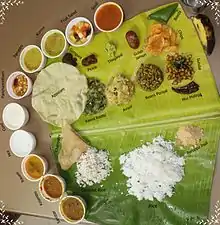 Un repas typique, du midi ou du soir, sera servi sur une feuille de bananier. Comme l'aliment de base est le riz, du riz à la vapeur sera servi avec toute une variété de plats de légumes, comme du sambar, du curry sec, du rasam et du kootu. Les repas sont souvent accompagnés par des appalam croustillantes.