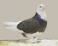 C'est un pigeon de taille moyenne qui donne une impression d'harmonie, aux épaules larges, la poitrine légèrement arrondie et la tête ovale. Il se tient droit avec une attitude alerte et montre debout un angle à 45 degrés. Le mâle mesure près de 23 centimètres et la femelle un peu moins de 22 centimètres. Ses tarses sont toujours emplumés[5].