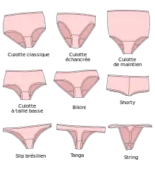 Lorsque sa partie arrière n'est constituée que d'une fine bande de tissu passant entre les fesses, elle est aussi appelée string. En France, « slip » désigne couramment ce sous-vêtement, plus généralement pour les hommes que pour les femmes, pour lesquelles le terme « culotte » reste plus répandu.