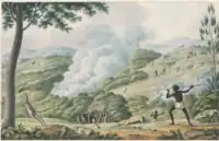 Aborigènes utilisant le feu pour chasser les kangourous, par Joseph Lycett (en) (c. 1817).
