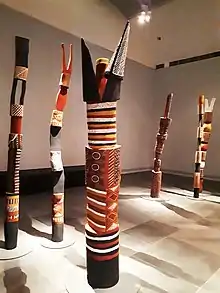 Les Yolngu et les Bininj (en) (tous deux de la Terre d'Arnhem) fabriquent des poteaux funéraires (ou lorrkkon, ḻarrakitj, ḏupun). Destiné traditionnellement à contenir les ossements d'une personne et aux rites funéraires, ces troncs d'arbre creux décoré de motifs élaborés sont dorénavant de pures créations artistiques. L'exposition permanente Mémorial aborigène de la Galerie nationale d'Australie, se compose de 200 créations, créés par 43 artistes[39],[40].