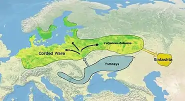 La culture d'Andronovo est en fait issue de la culture de Sintachta, elle-même directement issue d'une migration provenant de la culture de la céramique cordée en Europe du centre-nord, qui est une autre culture indo-européenne également issue de la culture Yamna[alpha 1]. La culture d'Andronovo est donc le fruit d'une seconde vague de migration de l'Europe vers l'Asie centrale, indépendante de celle qui avait engendré la culture d'Afanasievo. Les haplotypes Y trouvés dans la culture d'Andronovo le confirment également puisqu'ils sont majoritairement R1a, comme ceux de la culture de la céramique cordée en Europe centrale[21],[22].