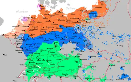 Le haut-allemand est parlé au sud et domine tout le nord de l’Europe. Mais c’est seulement au XIVe siècle que commence à se former une langue commune, réunissant les différents dialectes de cette zone. Le Hochdeutsch est né de la volonté de communiquer entre les différentes chancelleries. C’est en premier lieu une langue écrite même si le latin reste la langue de référence[20].