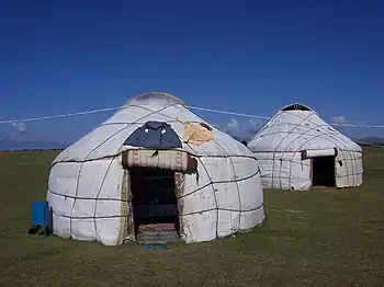 Les kirghizes ont développé avec beaucoup de raffinement les artisanats liés à la fabrication et à la décoration de la yourte. Faite d'épaisses toiles de feutre, arrimées à leur structure de bois par des bandes de laine multicolore tressées, la yourte peut être ornée de bandes décoratives à l'extérieur et surtout à l'intérieur. Les motifs traditionnels sont exécutés en couleurs très vives.