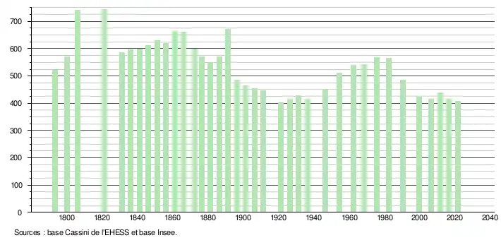 L'évolution du nombre d'habitants est connue à travers les recensements de la population effectués dans la commune depuis 1793. Pour les communes de moins de 10 000 habitants, une enquête de recensement portant sur toute la population est réalisée tous les cinq ans, les populations légales des années intermédiaires étant quant à elles estimées par interpolation ou extrapolation[14]. Pour la commune, le premier recensement exhaustif entrant dans le cadre du nouveau dispositif a été réalisé en 2006[15].