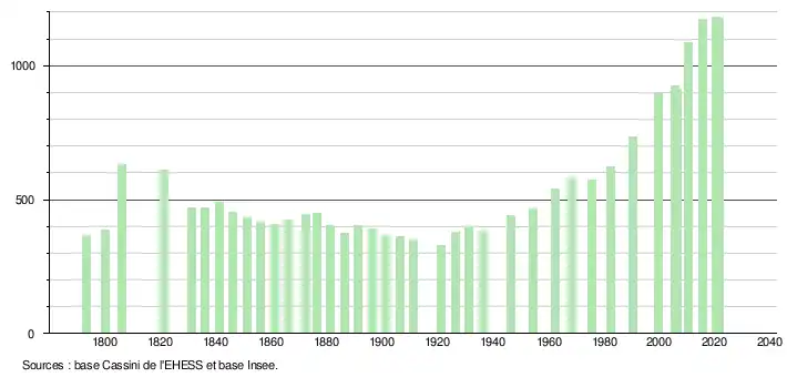 L'évolution du nombre d'habitants est connue à travers les recensements de la population effectués dans la commune depuis 1793. Pour les communes de moins de 10 000 habitants, une enquête de recensement portant sur toute la population est réalisée tous les cinq ans, les populations légales des années intermédiaires étant quant à elles estimées par interpolation ou extrapolation[21]. Pour la commune, le premier recensement exhaustif entrant dans le cadre du nouveau dispositif a été réalisé en 2005[22].
