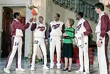 Les Globetrotters de Harlem avec Nancy Reagan lors d'une séance photo. Curly Neal (no 22) y réalise l'un de ses tours.