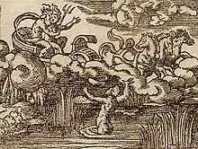Estampe de Bernard Salomon faisant partie de l'édition de 1564 de La Métamorphose d'Ovide figurée, publiée par le typographe français Jean de Tournes. L'illustration montre Cyané qui tente d'empêcher Pluton d'enlever Proserpine et qui, ne parvenant pas à sauver son amie, se dissout dans les larmes et se fond dans son bassin.