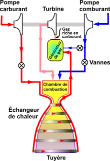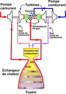 Dans un cycle à combustion étagée, une partie des ergols passe dans une ou plusieurs préchambres de combustion, dans lesquelles la proportion de carburant (combustion fuel rich) ou de comburant (combustion oxidizer rich) est volontairement trop élevée, dans le but d'obtenir une combustion incomplète. Les gaz sortant de cette préchambre de combustion entrainent la turbine de la turbopompe avant d'être injectés dans la chambre de combustion principale avec le reste des ergols[2],[3]. Dans la mesure où tous les ergols sont éjectés par la tuyère et contribuent à la propulsion, le cycle à combustion étagée est un cycle fermé.