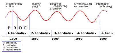 Cinq cycle d'innovation ou mini révolutions industrielles correspondant aux cinq cycles de Kondratiev ont été proposés, avec des variantes et des contestations :