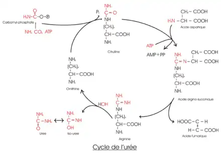 Le cycle de l'urée ou cycle de l'ornithine est un cycle de réactions biochimiques chez les espéces ureotéliques qui produisent de l'urée à partir de l'ammoniac. Il s'agit du premier cycle métabolique identifié dès 1932 par Krebs et Hensenleit. Ce cycle se déroule dans le foie, au sein des hépatocytes périportaux. L'une des particularités de ce cycle est d'être à cheval entre deux compartiments subcellulaires : le cytosol et la mitochondrie. À droite, un schéma simpliste du cycle de l'urée.