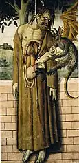 | Les remords et le suicide de Judas | Matthieu 27, 3-5[1] ; Actes des Apôtres 1, 18[3] | Scène rarement représentée dans les cycles peints puisqu'elle est secondaire pour la compréhension du discours et est parfois couplée avec la Montée au Calvaire. Judas peut être en train de jeter sa bourse, ou le plus souvent, il est représenté pendu. A côté, le diable récupère son âme. Cette scène avec les entrailles qui sortent du ventre est dramatique et nous rappelle les Mystères de la Passion qui popularise cet épisode peu présent dans les textes religieux. | ![]() Jean Canavesio, Suicide de Judas, chapelle Notre-Dame-des-Fontaines, La Brigue, 1492 |
