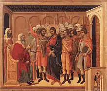 | Le Jugement d'Anne | Jean 18, 13-22[1] | Cette scène est très rarement présente dans les cycles de la Passion du Christ. Le grand-prêtre du Temple de Jérusalem, Anne, est le plus souvent représenté sous les traits d'une personne âgée. On peut aussi reconnaître cette scène grâce au soufflet donné par un serviteur à Jésus.