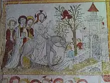 | L'entrée dans Jérusalem | Matthieu 21, 1-11[1] ; Marc 11, 1-10[1] ; Luc 19, 29-40[1] : Jean 12, 12-19[1] | Scène qui présente peu de variations. Jésus entre dans la ville de Jérusalem sur un âne ou une ânesse, faisant un geste de bénédiction, suivit par le groupe d’apôtres. Les habitants posent aussi des vêtements et des branches d’arbres sur la route vers la porte de la ville fortifiée, en signe d'adoration. | ![]() Entrée dans Jérusalem, troisième quart du XVe siècle, église Saint-Martin de Jenzat |