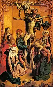 | Le Crucifiement | Matthieu 27, 35[1] ; Marc 14, 24[1] ; Luc 23, 33[1] ; Jean 19, 18[1] ; Livre de la Passion, v. 1305 à 1322[2] | Cette scène est peu représentée puisqu'elle n'est pas essentielle au récit et mentionnée brièvement dans les textes religieux. Les bourreaux clouent les mains de Jésus ou hissent la croix avec des cordes. | ![]() Maître de la Passion de Karlsruhe, Mise en croix, vers 1455-1460, huile sur bois, Karlsruhe, Staatliche Kunsthalle |