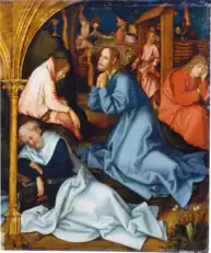 | La Descente de croix | Matthieu 27, 57-61[1] ; Marc 15, 42-47[1] ; Luc 23, 50-55[1] ; Jean 19, 38-42[1] | Cette scène est rarement représentée puisque la plupart des cycles de la Passion se concluent avec la scène précédente. Souvent, la Vierge, saint Jean-Baptiste, Marie-Madeleine et Joseph d'Arimathie accompagnent le corps du Christ. Parfois, nous voyons une échelle puisque c'est par là que Joseph d'Arimathie a descendu le corps du Christ. | ![]() Maître du retable de Barthélémy, La Déposition, 1509, huile sur bois, Londres, National Gallery |