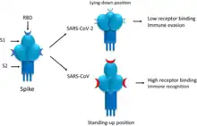 La protéine S (dites protéine spike ou protéine spicule) du SARS-CoV-2 forme des péplomères. Elle est constituée de deux sous-unités fonctionnelles : la sous-unité S1 permet la liaison du virus au récepteur de la cellule hôte et la sous-unité S2 assure la fusion de l’enveloppe virale avec la membrane cellulaire[26].